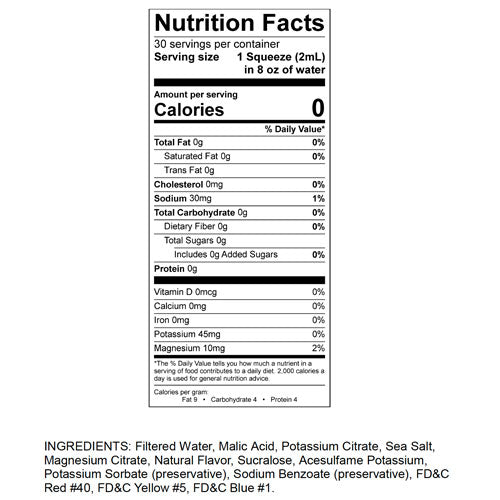Filtered Water, Malic Acid, Potassium Citrate, Sea Salt, Magnesium Citrate, Natural Flavor, Sucralose, Acesulfame Potassium, Potassium Sorbate (preservative), Sodium Benzoate (preservative), FD&C Red #40, FD&C Yellow #5, FD&C Blue #1.